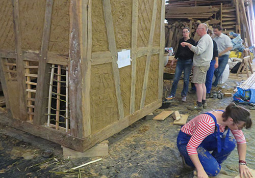 Briqueterie Lanter – Hochfelden (Bas-Rhin) Stage Torchis – techniques traditionnelles en colombage Mise en place des palançons Tressage en noisetier Présentation des recettes traditionnelles de torchis Préparation des mélanges Application